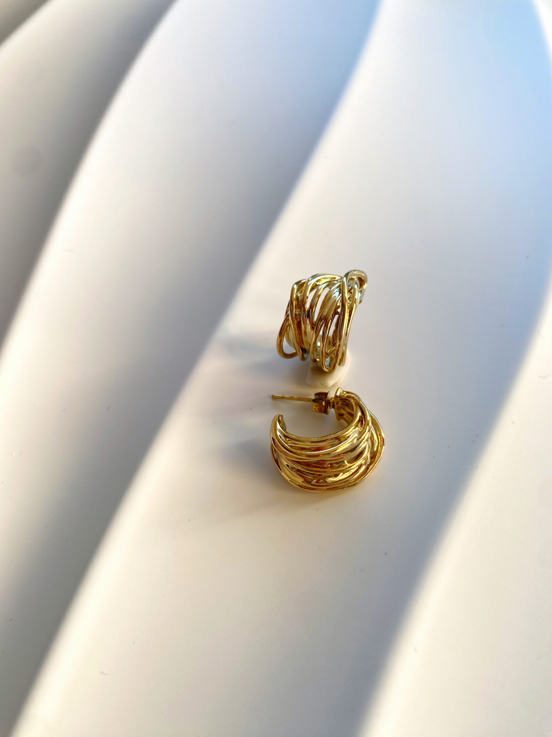 Pendientes dorados de acero inoxidable, con su diseño curvo con líneas entrelazadas crea un efecto elegante y contemporáneo que aporta luz y personalidad a cualquier look. Elegante y moderno.